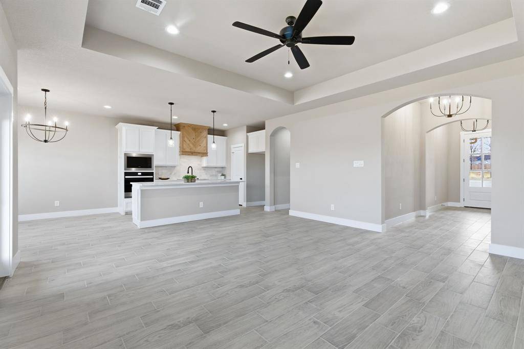 Step inside and be greeted by a beautiful arch doorway, leading into an inviting space with a boxed recessed ceiling that adds architectural charm. The open-concept living and kitchen area is designed for effortless entertaining, featuring large windows that flood the space with natural light, creating a warm and airy ambiance.