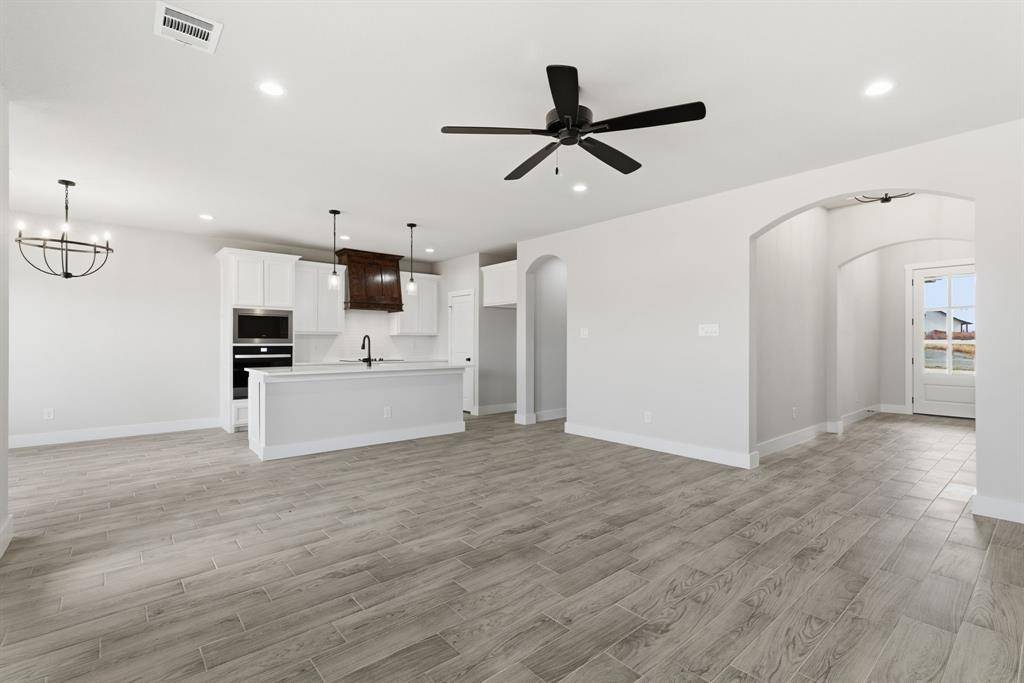 Step inside and be greeted by a beautiful arch doorway, leading into an inviting space with a boxed recessed ceiling that adds architectural charm. The open-concept living and kitchen area is designed for effortless entertaining, featuring large windows that flood the space with natural light, creating a warm and airy ambiance.