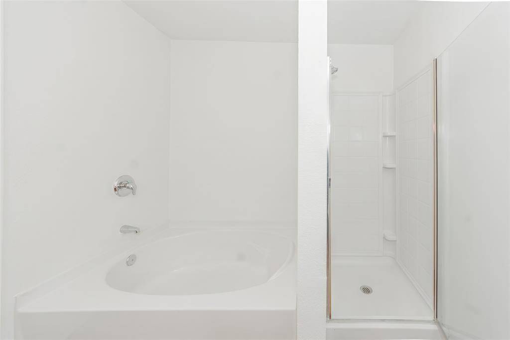 Suite Retreat: The spacious primary bedroom features an en-suite bath with both a separate shower and a relaxing garden tub,