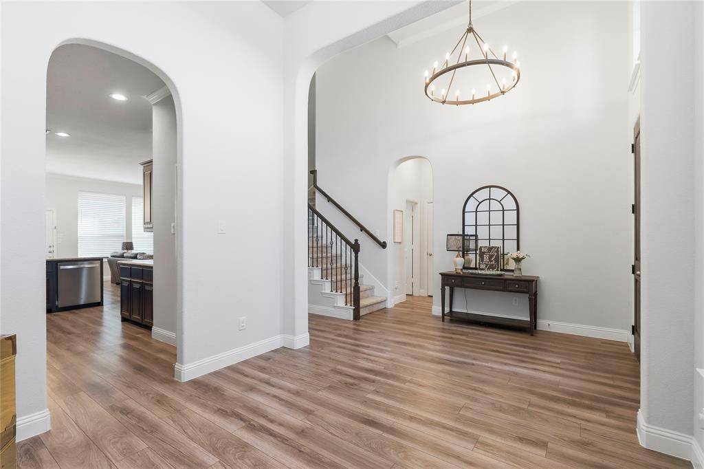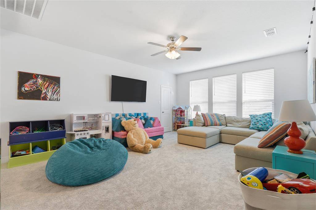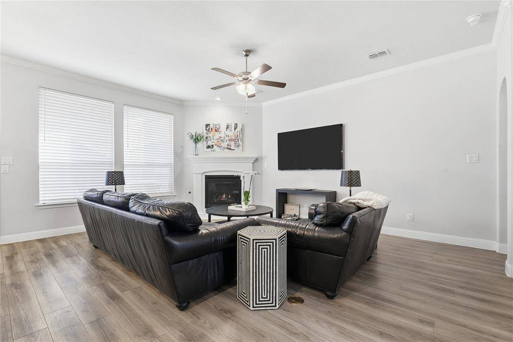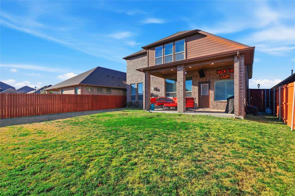 TASTEFULLY DESIGNED TWO-STORY loaded with UPGRADES in the HIGHLY SOUGHT-AFTER COMMUNITY of MORNINGSTAR! Entertain with ease in the open-concept floor plan designed for modern living, featuring extensive luxury plank flooring, new carpet with a 50-year warranty, fresh paint, soaring ceilings, crown molding, wrought iron spindles, and a cozy fireplace. Bring your recipes to life in the well-appointed kitchen showcasing granite countertops, stainless steel appliances, a pantry, and a breakfast nook with plantation shutters. The secluded primary suite provides a calm, private setting, complete with a sliding barn door, tray ceiling, dual sink vanity, soaking tub, separate shower, and a walk-in closet. Make great use of the upstairs offering a large game room and generous secondary bedrooms with walk-in closets. Spend time outdoors in your spacious backyard with plenty of room to play, or relax on your large covered patio boasting a gas stub for a grill and an outdoor TV. Other features include a re-stained garage door, Trimlight permanent LED holiday lighting, gorgeous curb appeal highlighted by lush landscaping and custom hardscaping, plus a recently replaced roof, gutters, and fence. Morningstar residents have access to oversized community pools, a splash pad, playground, outdoor grilling, stocked fishing ponds, miles of trails, sports courts, open green space, a community garden, planned community events, and a dog park. Attends top-rated schools! Take a first-person look at this gorgeous home! Click the Virtual Tour link to see the 3D Tour!