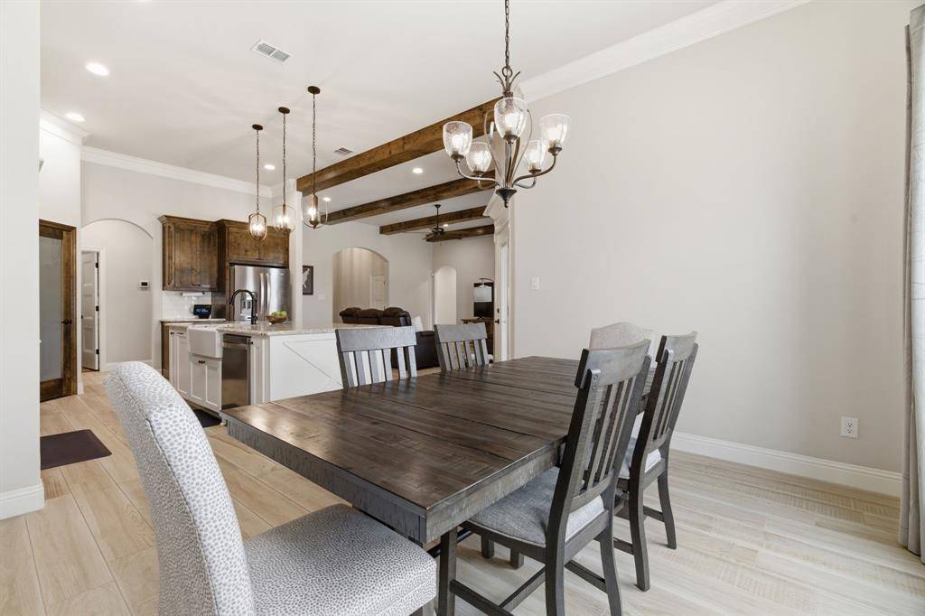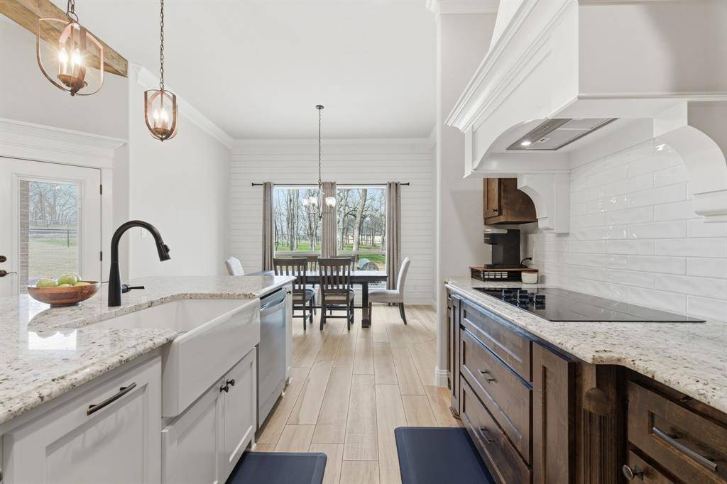 The heart of the home is the oversized island with gorgeous granite countertops, ample seating, and stylish pendant lighting. Rich cabinetry, stainless steel appliances, and a charming shiplap accent in the dining area complete the thoughtfully designed kitchen space.