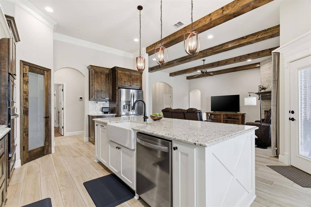 Step inside to an inviting open-concept layout featuring wood-look tile flooring, soaring ceilings with exposed wood beams, and abundant natural light. The spacious living area flows seamlessly into the kitchen, making it ideal for both everyday living and entertaining.