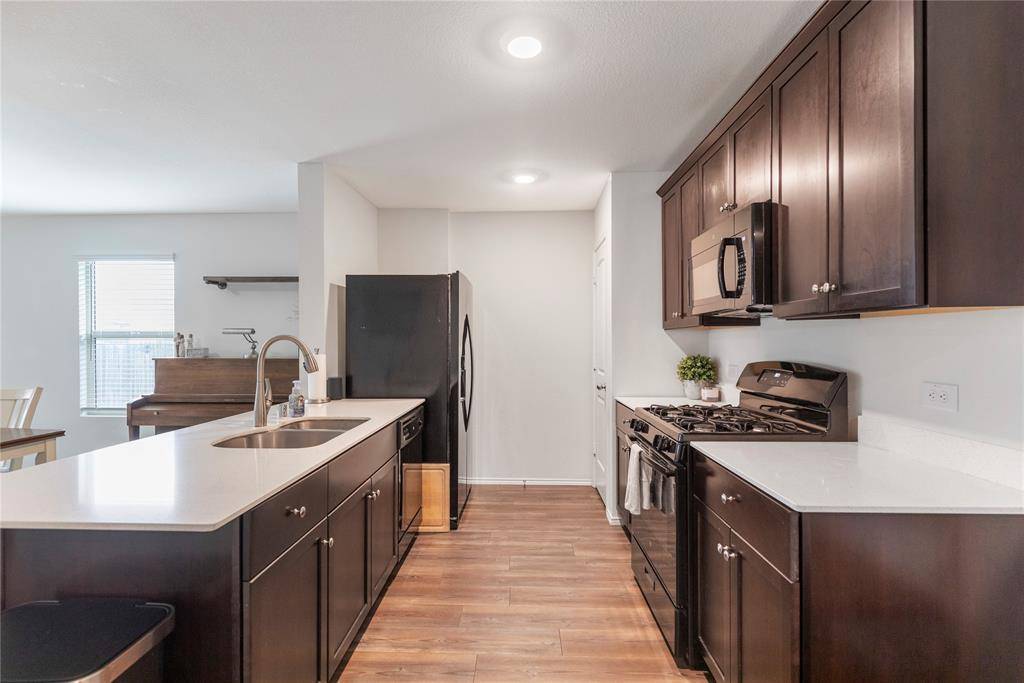 Inside, a thoughtfully designed open-concept layout connects the kitchen, dining, and living areas, ideal for everyday living and entertaining. Luxury Vinyl Plank flooring flows throughout the main living areas, creating a durable and cohesive modern look. The kitchen features rich cabinetry, elegant quartz countertops, a gas range, and a spacious center island with breakfast bar seating overlooking the dining and living spaces.