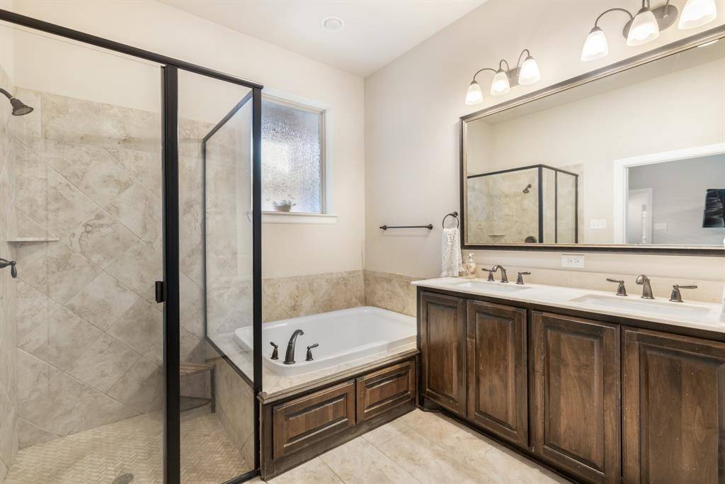 The private primary suite offers a relaxing retreat with generous space and a spa-inspired bath featuring dual sinks, a soaking tub, separate shower, and walk-in closet.
