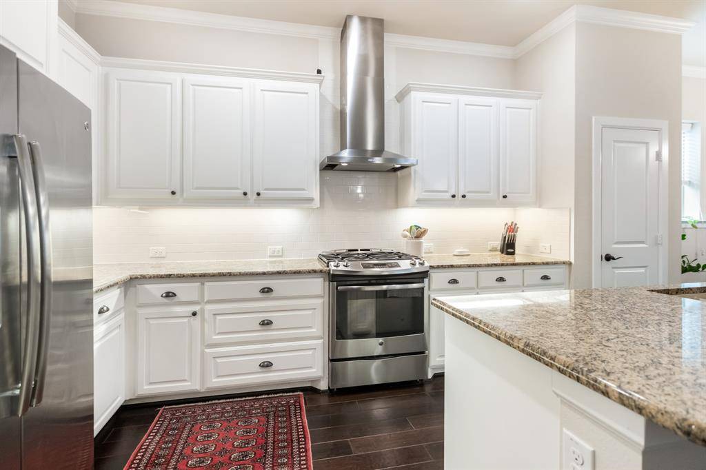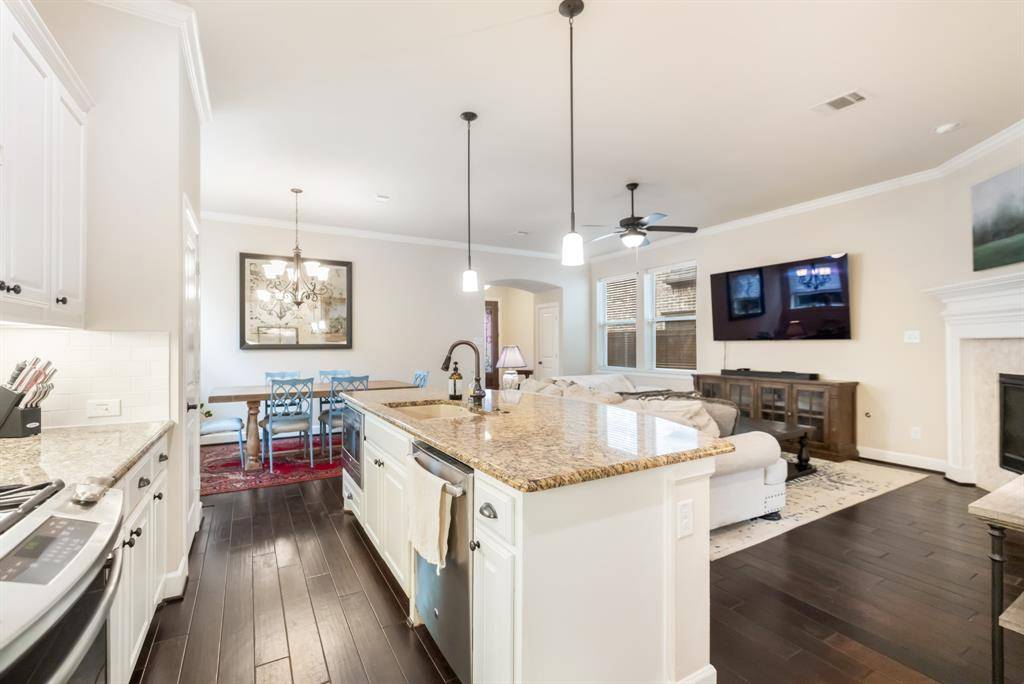 Inside, rich hardwood floors flow through the main living areas, where a spacious living room with a fireplace opens seamlessly to the kitchen and dining space. The kitchen features granite countertops, white cabinetry, stainless steel appliances, a gas cooktop, and a large island with seating—perfect for everyday living and entertaining.