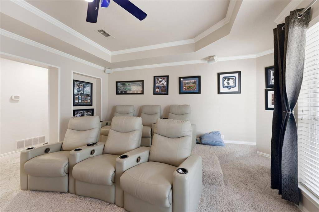 The chef's kitchen is equipped with stainless steel appliances, a four-burner gas stove, granite countertops, and custom glass-front wood cabinetry. An island provides ample space for meal prep, while a fully functional breakfast bar with a sink separates the kitchen from the main living room—perfect for entertaining. The second floor offers an additional suite with a full bath, along with four more bedrooms. Relax with family and friends in your media room, which features built-in riser seating that ensures everyone has the BEST SEAT in the house. As an added bonus the media room includes leather recliners with a surround sound system. Stepping outside the media room leads to a private balcony overlooking the golf course. And that's not all…