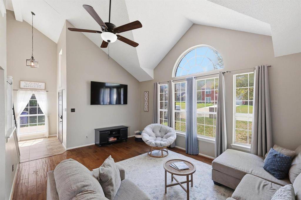 From the moment you step inside, you'll feel right at home. Soaring ceilings, abundant natural light, and a neutral palette create a welcoming atmosphere. The layout features two spacious living areas, perfect for both everyday living and entertaining. A generous front living room offers flexibility, while the back living area, complete with a wood-burning fireplace opens to the kitchen and showcases views of the backyard and pool.