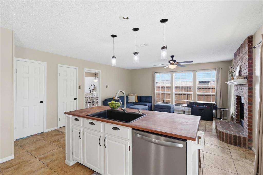 A dedicated dining room is perfectly positioned for hosting gatherings, while the kitchen blends charm and function with butcher block countertops, stainless steel appliances, an island with seating, and a cozy breakfast nook overlooking the pool.