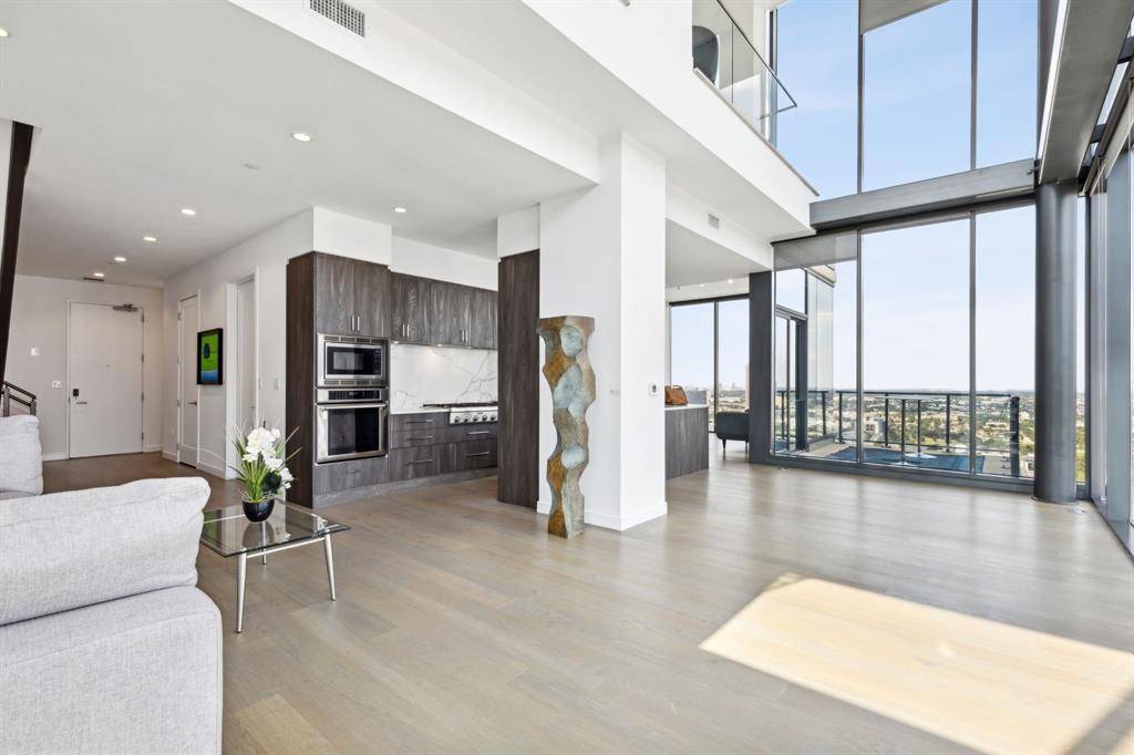 Oversized windows with downtown views! Experience unparalleled luxury in this one-of-a-kind split-level penthouse at Residences at Park District. Offering breathtaking, panoramic views of Klyde Warren Park and the vibrant downtown skyline. The expansive living area features high ceilings and floor-to-ceiling windows that flood the space with natural light, creating an airy and inviting atmosphere. The sleek, modern kitchen and sophisticated design elements make this penthouse an entertainer's dream. Enjoy the convenience of having a variety of top-rated restaurants just a short walk away, enhancing the urban living experience. This penthouse is truly a rare gem, combining stunning aesthetics with unmatched location and luxury.