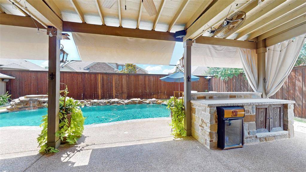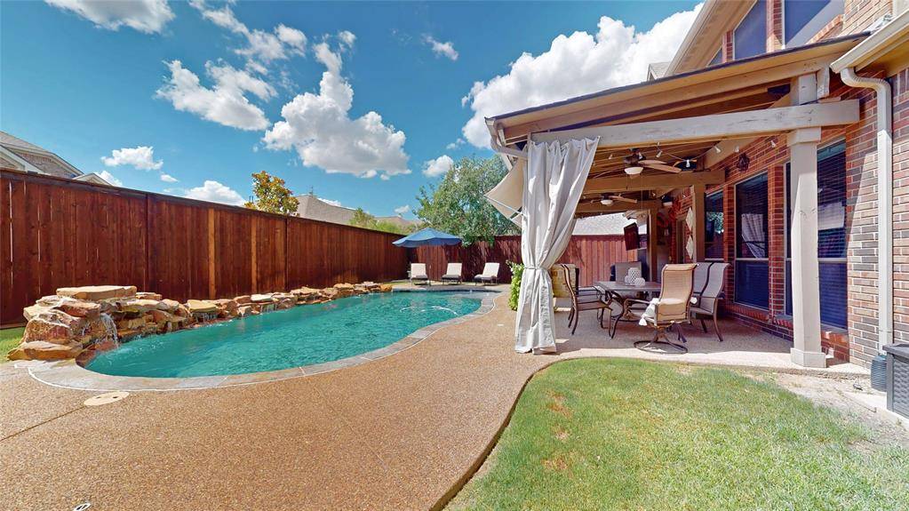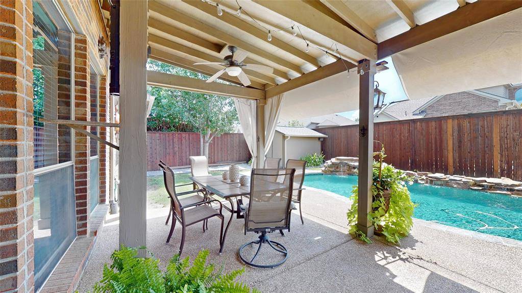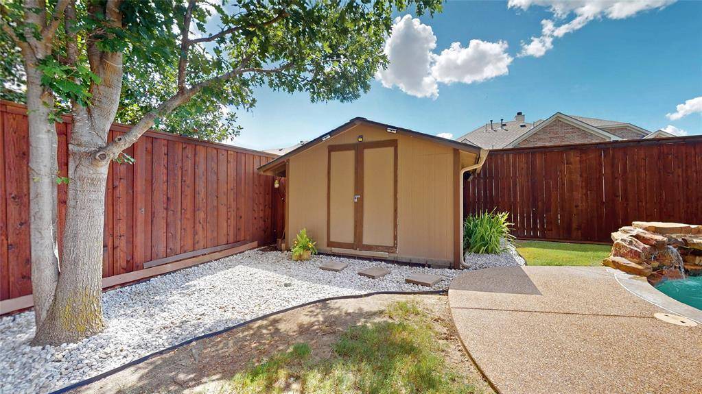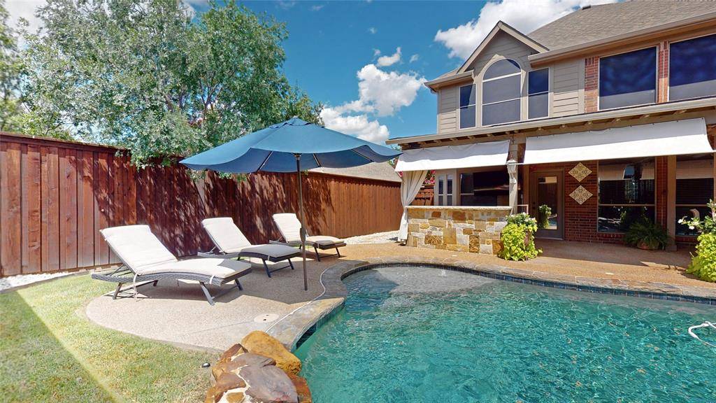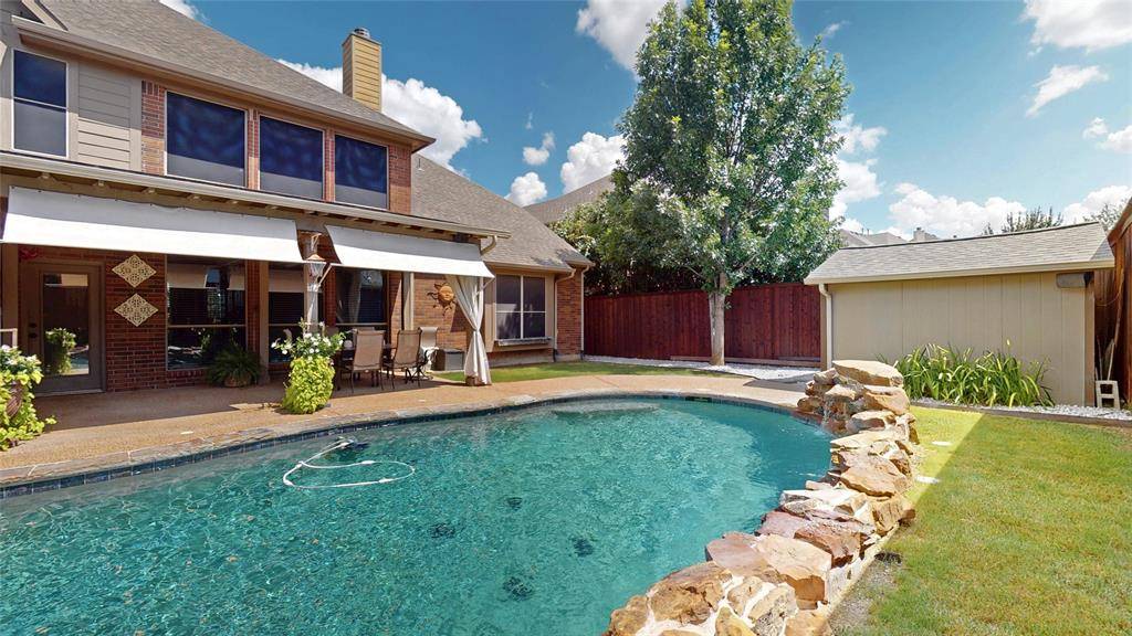 BACKYARD OASIS! Gorgeous 2-story in Marshall Ridge with beautiful brick and stone elevation and lush landscaping! Built by Meritage homes, this sprawling plan offers 3460 sqft of living space spanning 4 bedrooms, 3.5 baths, formal dining area, flex space that makes a terrific home office or formal living, upstairs game and media rooms, and 2-car garage! Upgrades and amenities include rich hardwood flooring throughout main living areas, designer paint tones, wrought iron balusters, spacious family room with towering ceilings and cozy stone fireplace, new roof and 2 AC units in 2021, blown in insulation added, security cameras, and MORE! Gourmet kitchen boasts granite countertops with a stone backsplash, large island with stone faced breakfast bar, soft close cabinetry, stainless appliances with a gas cooktop, and eat-in area with bay window. Primary bedroom offers a luxurious ensuite bath with dual vanities, garden tub with separate shower, and large walk-in closet. Incredible backyard is an entertainer's dream, complete with an expansive 30x12 covered patio area with outdoor kitchen, sparkling saltwater pool with new salt cell installed 2025 and Hayward variable speed pump in 2021, 9ft privacy fence, and 10x12 storage shed!