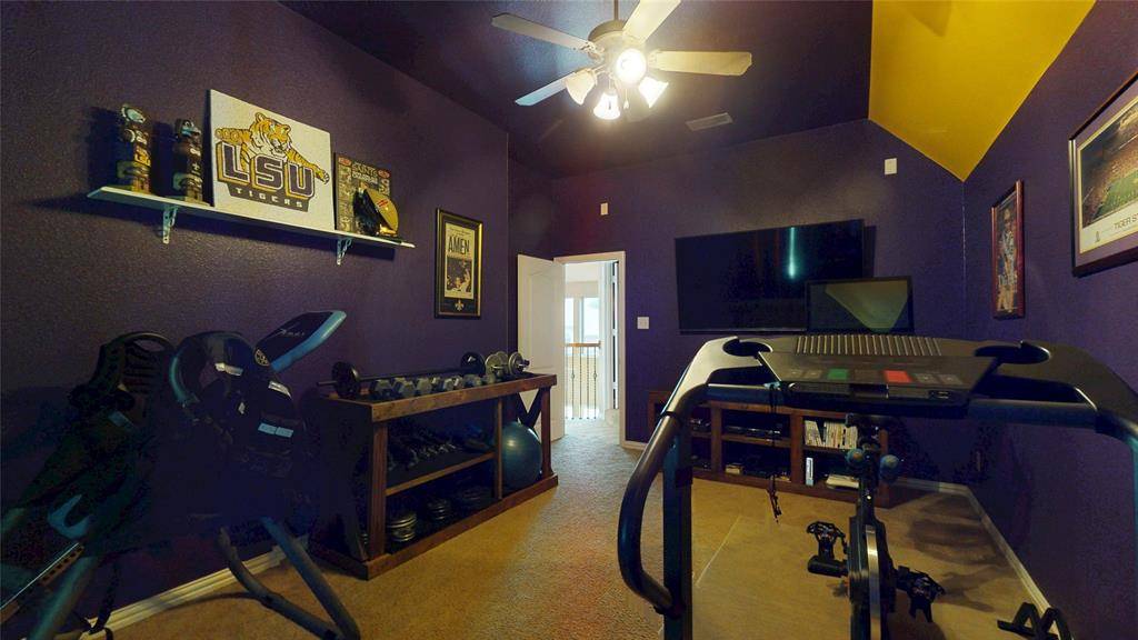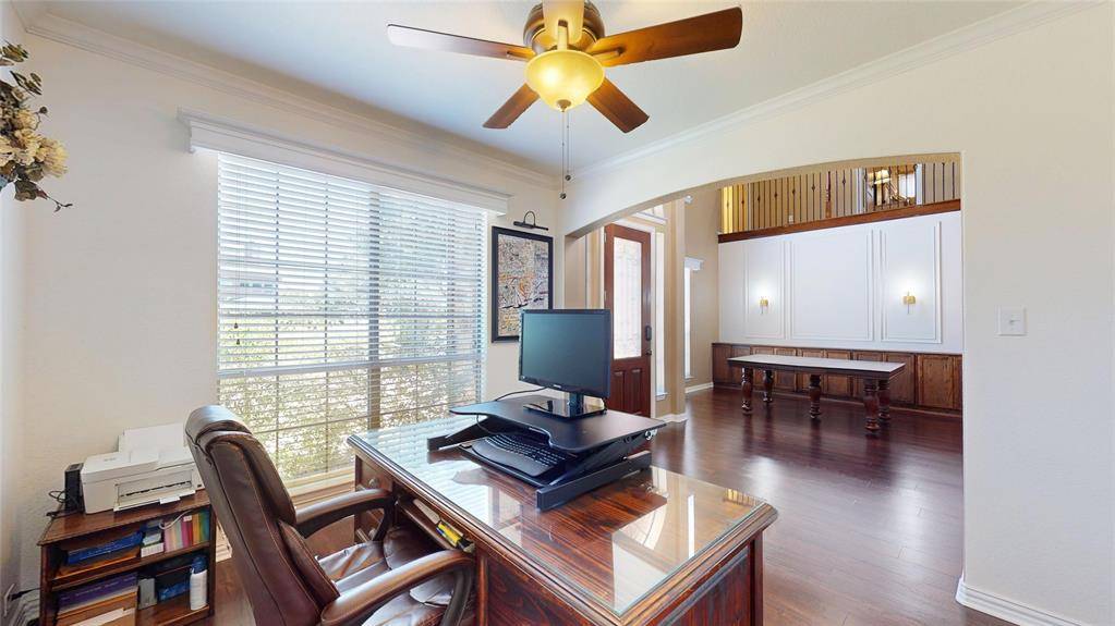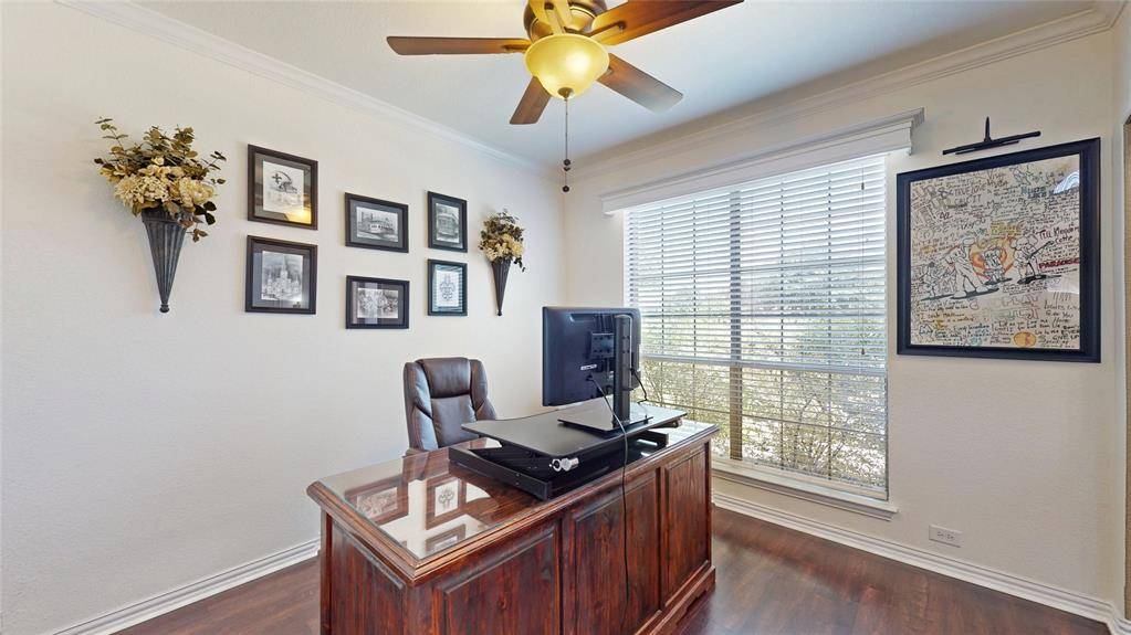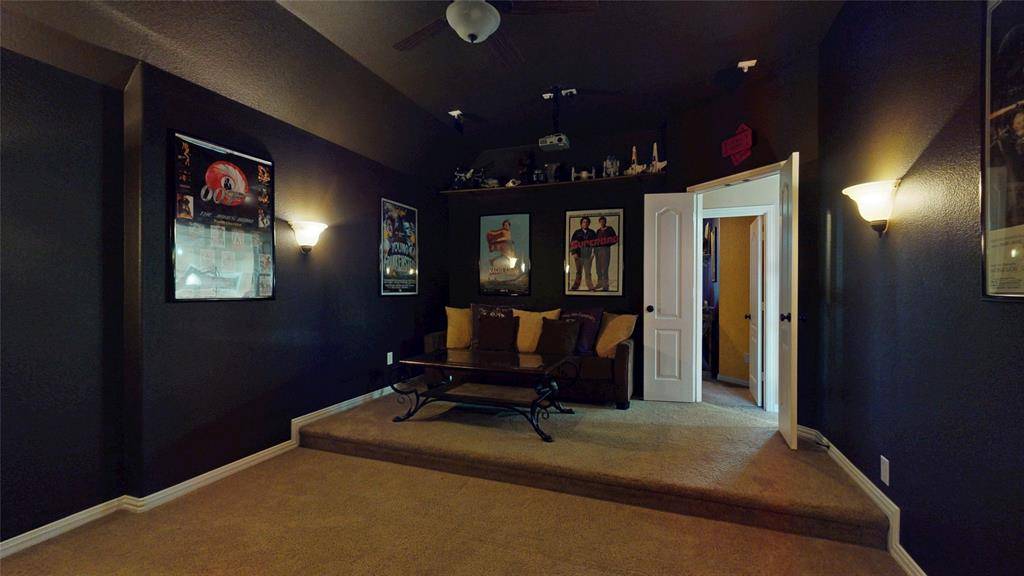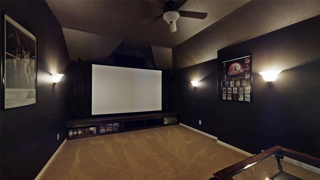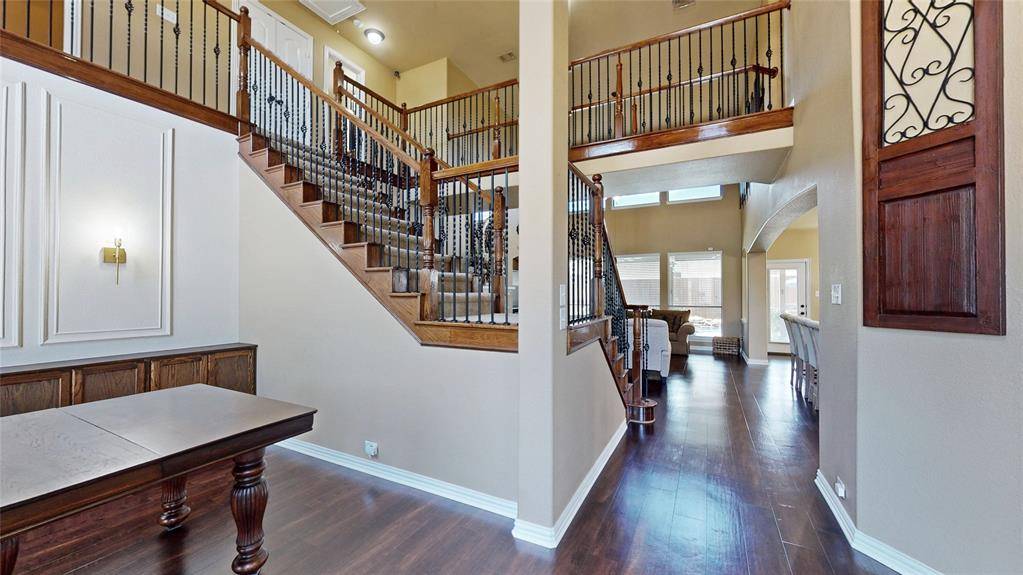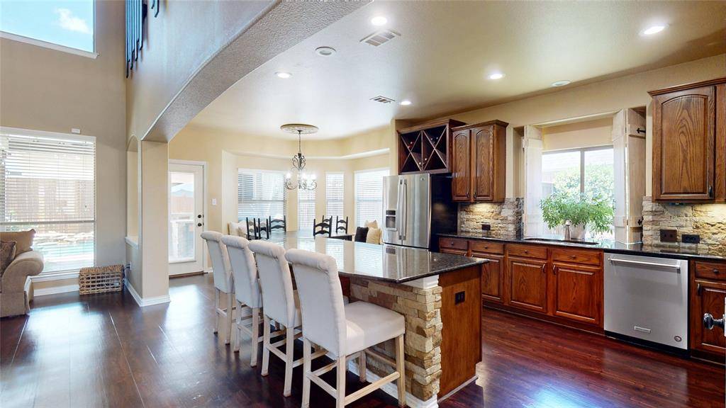 BACKYARD OASIS! Gorgeous 2-story in Marshall Ridge with beautiful brick and stone elevation and lush landscaping! Built by Meritage homes, this sprawling plan offers 3460 sqft of living space spanning 4 bedrooms, 3.5 baths, formal dining area, flex space that makes a terrific home office or formal living, upstairs game and media rooms, and 2-car garage! Upgrades and amenities include rich hardwood flooring throughout main living areas, designer paint tones, wrought iron balusters, spacious family room with towering ceilings and cozy stone fireplace, new roof and 2 AC units in 2021, blown in insulation added, security cameras, and MORE! Gourmet kitchen boasts granite countertops with a stone backsplash, large island with stone faced breakfast bar, soft close cabinetry, stainless appliances with a gas cooktop, and eat-in area with bay window. Primary bedroom offers a luxurious ensuite bath with dual vanities, garden tub with separate shower, and large walk-in closet. Incredible backyard is an entertainer's dream, complete with an expansive 30x12 covered patio area with outdoor kitchen, sparkling saltwater pool with new salt cell installed 2025 and Hayward variable speed pump in 2021, 9ft privacy fence, and 10x12 storage shed!