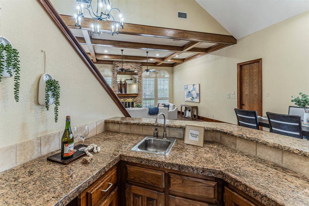 Further into the home, you'll find a custom bar built into the corner of the staircase that features a sink,