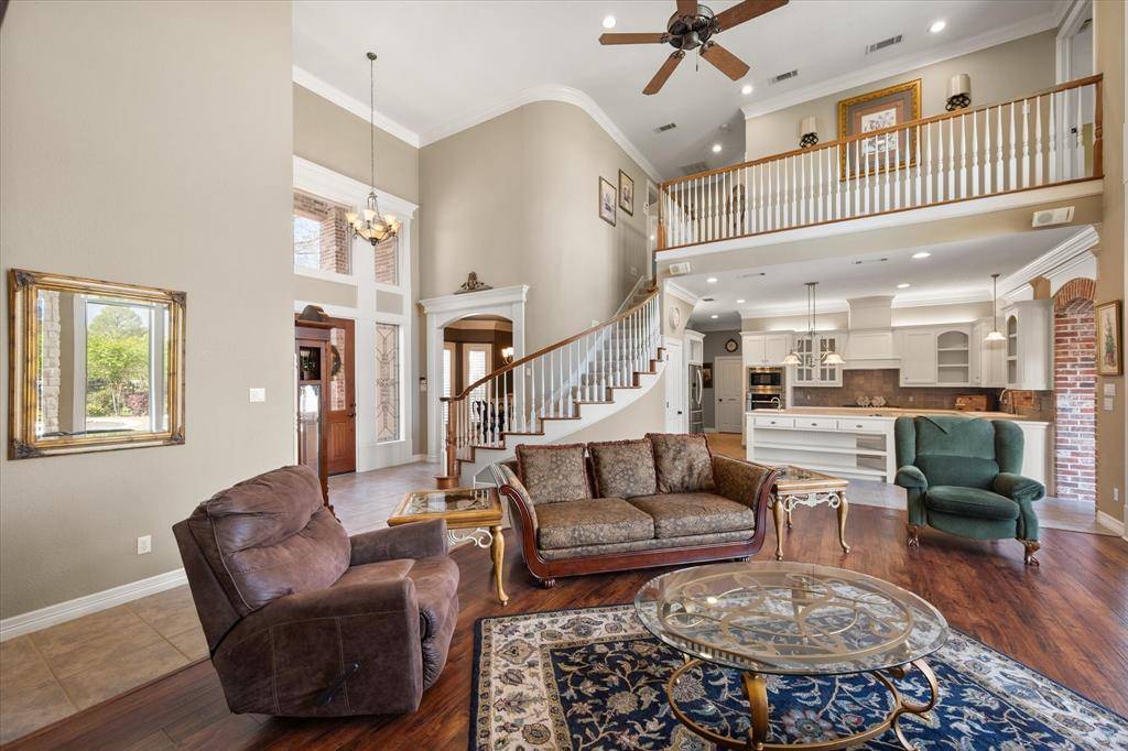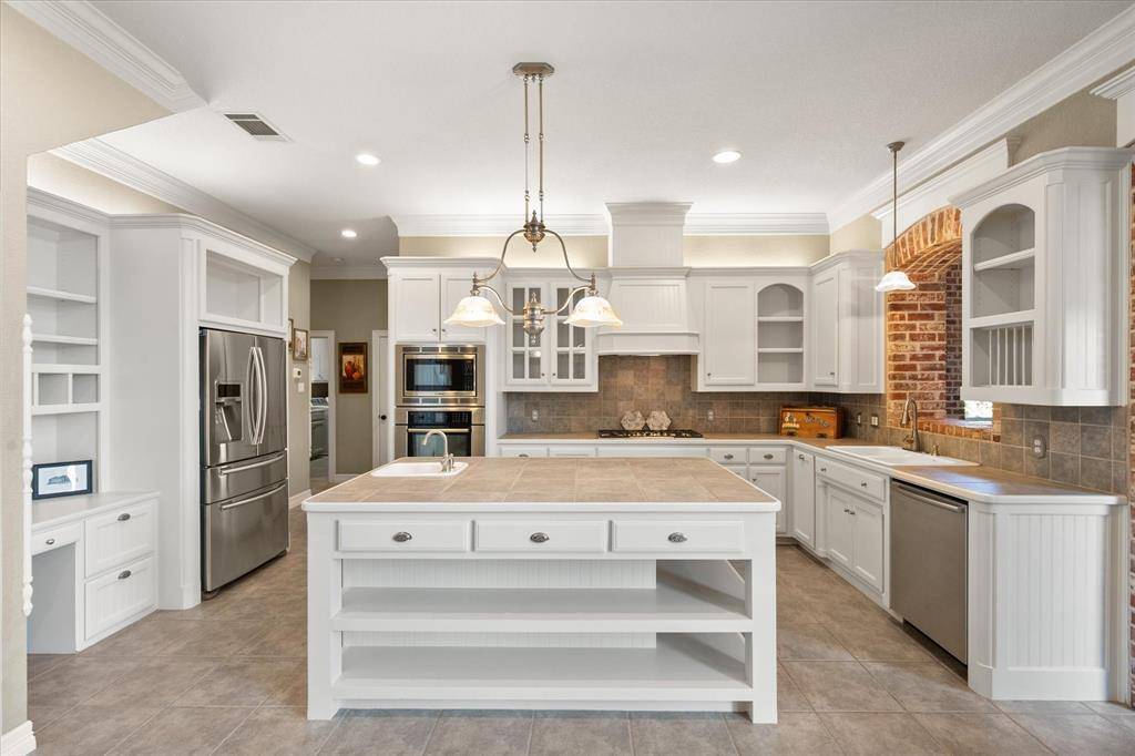 Features include an elegant circle driveway, soaring ceilings, a sweeping staircase, and an open-concept layout flooded with natural light. The gourmet kitchen offers a massive island, prep sink, and butler's pantry. Unique brick accents and built-ins add character throughout.